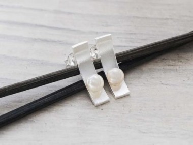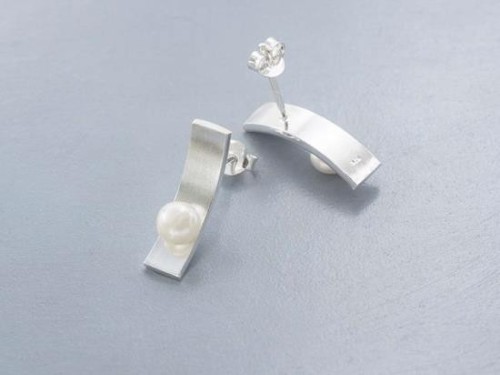 1 pair of 925 Sterling Silver Curved Bar Stud Earrings, With Pearl.